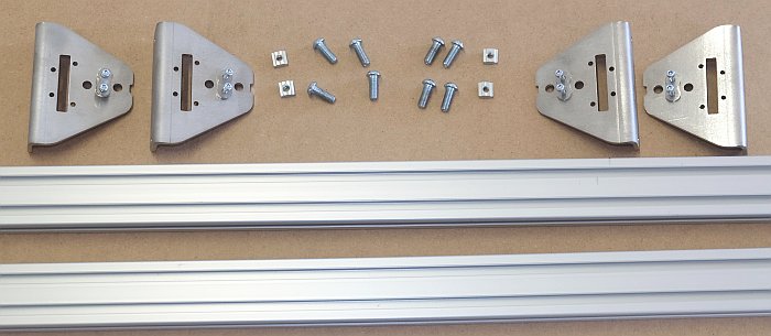 Préparer les 4 équerres triangulaires en inox, 4 écrous profilés M5, 8 vis M6x16 à tête bombée et les 2 grands profilés 20x40 non utilisés.