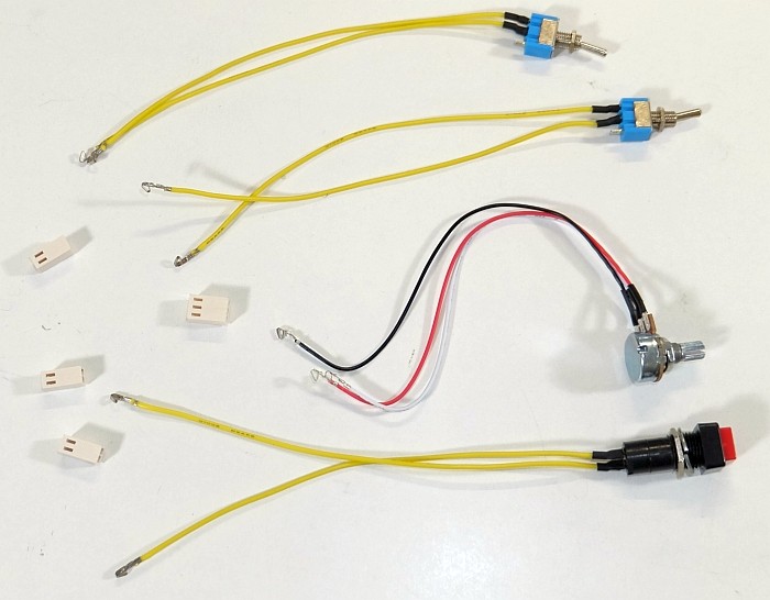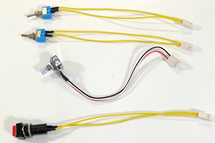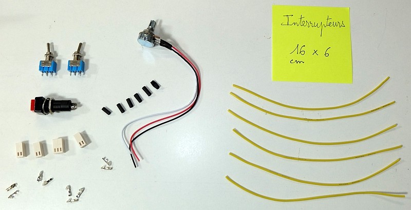 Visser à fond les écrous des interrupteurs à levier. Préparer le bouton du potentiomètre et les rondelles et écrous des interrupteurs.
