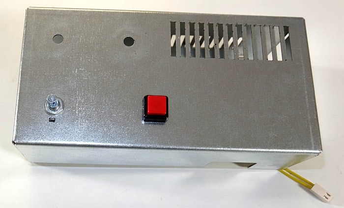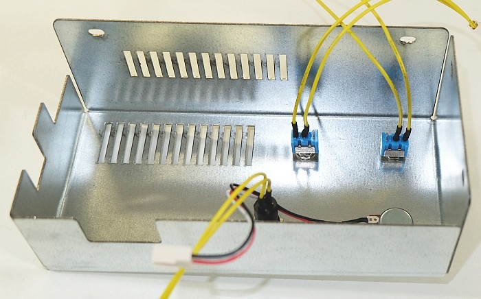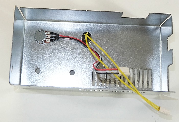 Mettre en place le potentiomètre et le bouton-poussoir à travers le capot en tôle (dévisser et enlever les écrous et rondelles, enfiler à travers la tôle, revisser).