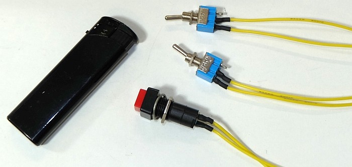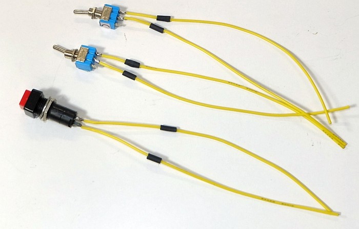 Souder les cables aux pattes des interrupteurs et du bouton-poussoir.