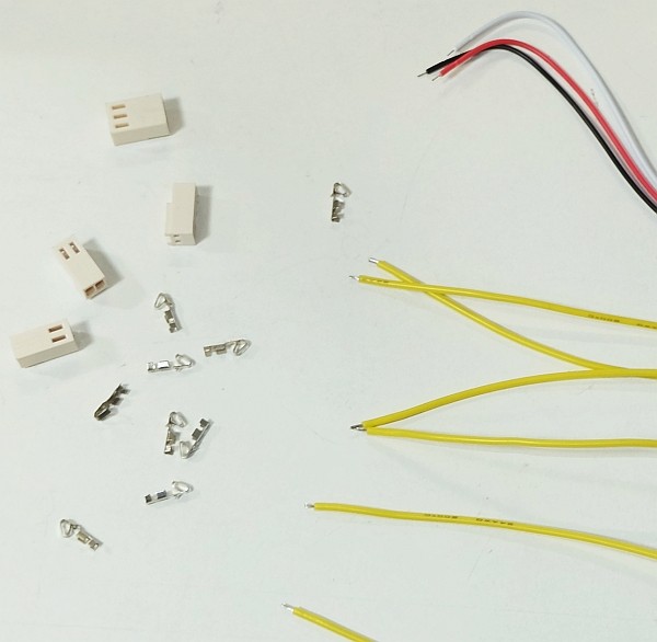 Clipper les cosses dans les boîtiers en plastique à 2 et 3 contacts comme sur l'image ci-dessous. Il peut être nécessaire de s'aider d'un petit tournevis ou d'une épingle pour pousser la cosse à fond (elle ne doit pas pouvoir ressortir si on tire sur le câble).