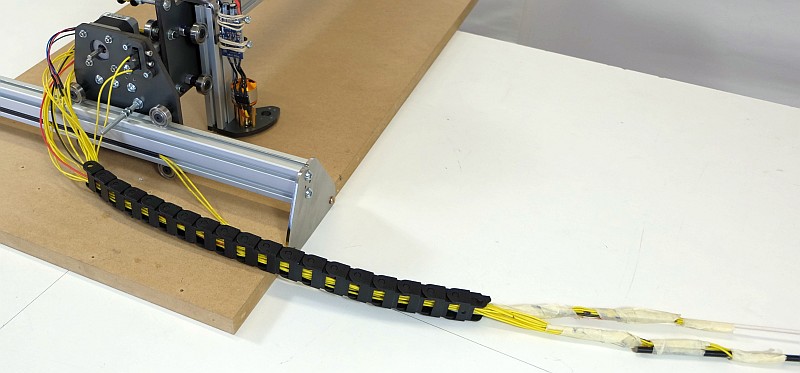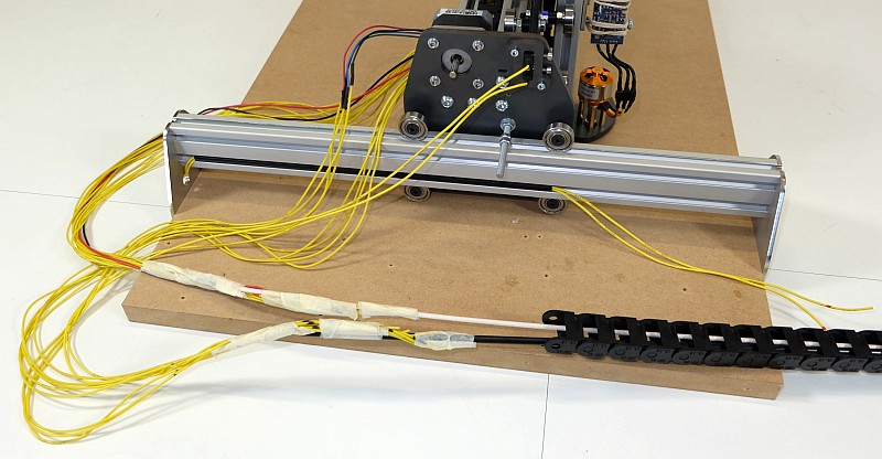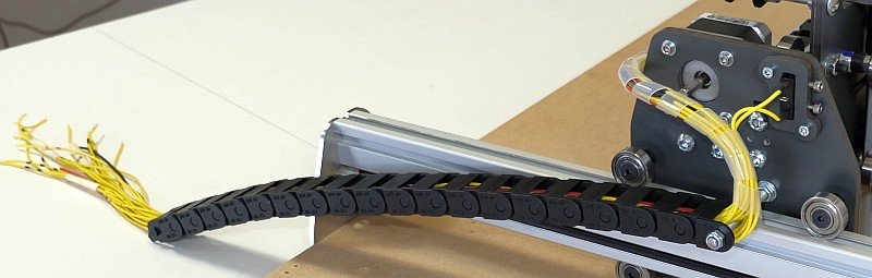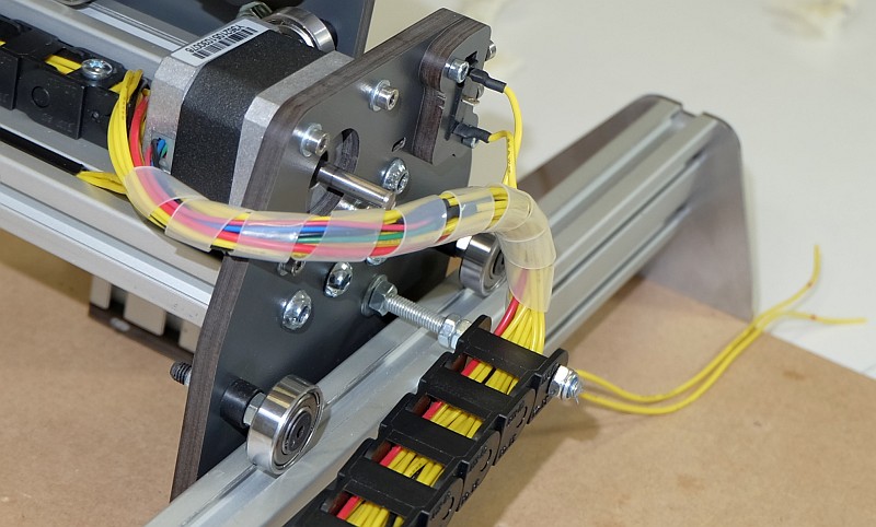 Bloquer les écrous M5 l'un contre l'autre en laissant du jeu à la chaîne pour qu'elle puisse pivoter librement. Tendre un peu les câbles (attention à laisser libre le passage de la poulie et de la courroie du chapitre suivant). Protéger et rassembler les câbles avec la grosse gaine spirale comme sur l'image ci-dessous. Couper l'excédent de gaine aux ciseaux ou à la pince coupante.
