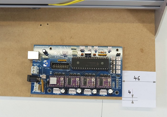 Positionner la carte à 46mm et 4mm des bords du plateau comme sur l'image ci-dessous et marquer sur le plateau l'emplacement des 4 trous de fixation.