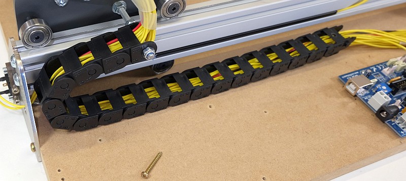 Passer un tire-câbles dans la chaîne porte-câble 15x10, (la plus courte et la plus large). Fixer les câbles des moteurs X et du FDC Y à ce tire-câbles avec du scotch, du côté du maillon qui peut être enfilé sur la vis M5x65 de la plaque en stratifié (voir l'image ci-dessous). Glisser également le premier tire-câbles dans la chaîne.