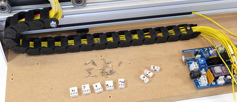 Un câble après l'autre : dénuder sur 2-3mm, sertir ou souder sur une cosse, clipper dans le bon connecteur femelle en plastique. Attention à respecter les couleurs des câbles moteurs, en prenant comme modèle le connecteur du moteur Z. (Voir le paragraphe Préparation des câbles longs – Moteur Z).