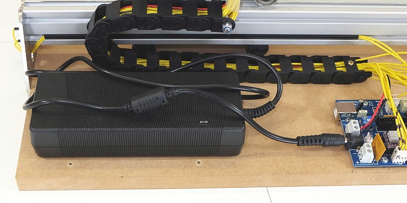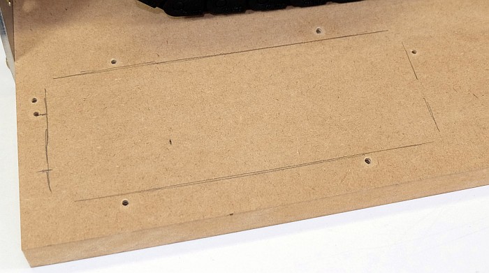 Positionner l'alimentation 12V à environ 15mm des bords du plateau, comme sur l'image ci-dessous et marquer son emplacement sur le plateau.