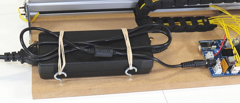 Connecter l'alimentation à la fiche J1 de la carte interface et l'immobiliser avec 2 fois 2 élastiques.