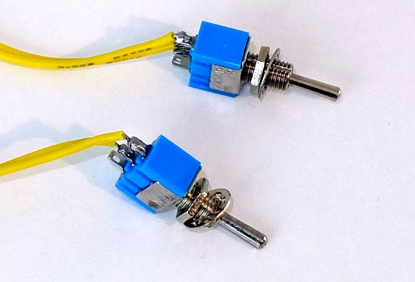 Astuce : pour serrer correctement les interrupteurs à levier, il faut serrer l'écrou plastique avec l'interrupteur à 45° comme sur l'image ci-dessous, puis redresser l'interrupteur en tenant l'écrou.